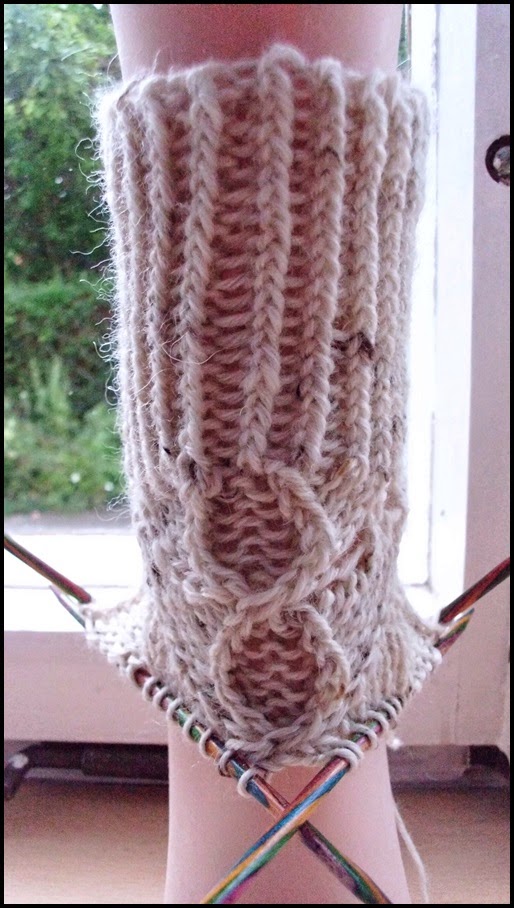 Es folgt sofort nach der letzten Bündchenrunde die Ferse auf Nadel 1 und 4. Ich habe mich für eine doppelte Ferse mit versetzten Maschen entschieden.