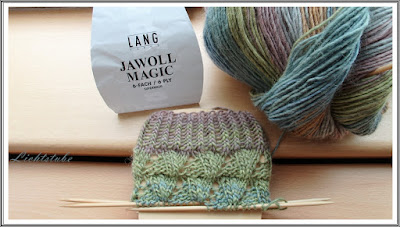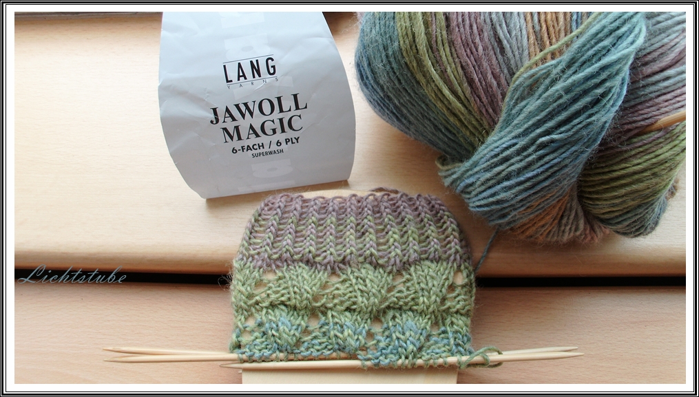5 x das Bündchenmuster, 1 Lochreihe (2 re zus,, 1 U), 5 x das Bündchenmuster