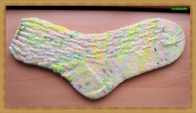 2. Runde: In die 2. re Masche von hinten einstechen, rechts stricken, aber auf der Nadel lassen. Dann die 1. re Masche rechts stricken und beide Maschen auf die re Nadel gleiten lassen. 2 li Maschen.