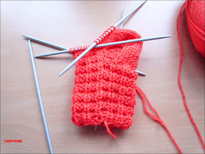 Die 1 zusätzliche Masche auf Nadel 4 verarbeiten, bis nach dem Käppchen nur noch 8 Maschen pro Nadel existieren.