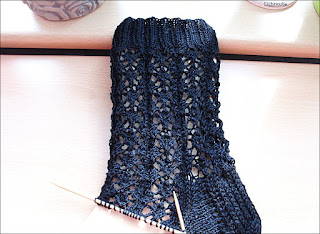 1. Runde des Mustersatzes – Nadel 4 – die letzten beiden Maschen zusammenstricken. Das Muster ist durch 9 teilbar, daher dieser Schritt.